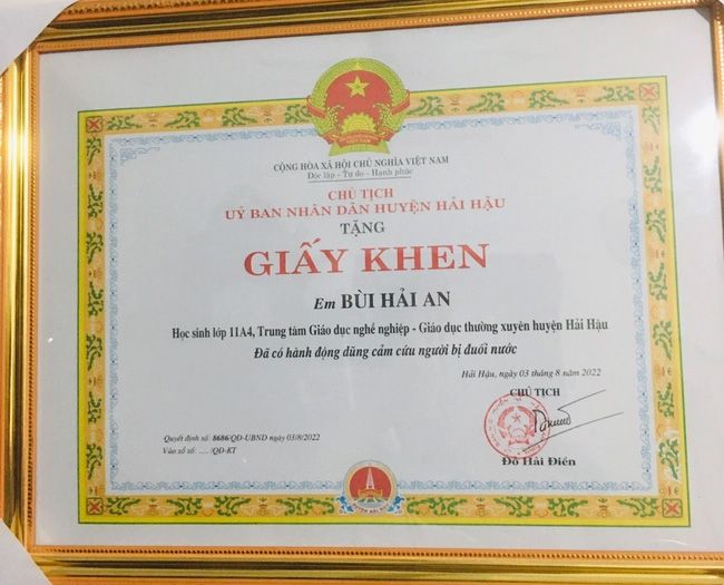 Tối 3/8, thông tin với chúng tôi, em Bùi Hải An (học sinh lớp 11 TTGDTX Hải Hà (huyện Hải Hậu, tỉnh Nam Định) phấn khởi cho biết, trưa cùng ngày, lãnh đạo cùng đoàn công tác của huyện đã đến gia đình trao Bằng khen cho em sau hành động dũng cảm cứu người đuối nước.
