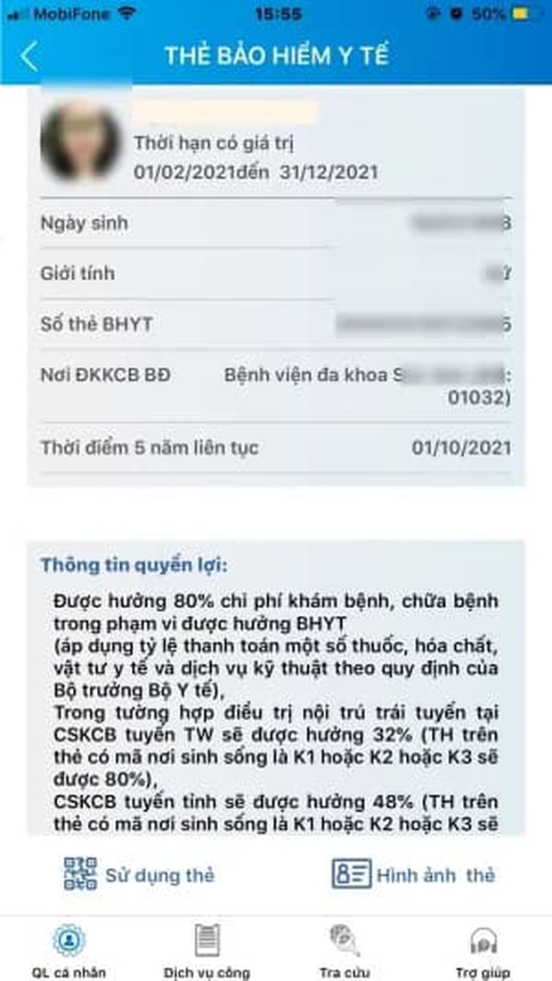 Hệ thống sẽ cung cấp về thẻ BHYT, bao gồm: Thời hạn của thẻ BHYT, nơi khám chữa bệnh, thời điểm đủ 5 năm liên tục, quyền lợi về BHYT…
