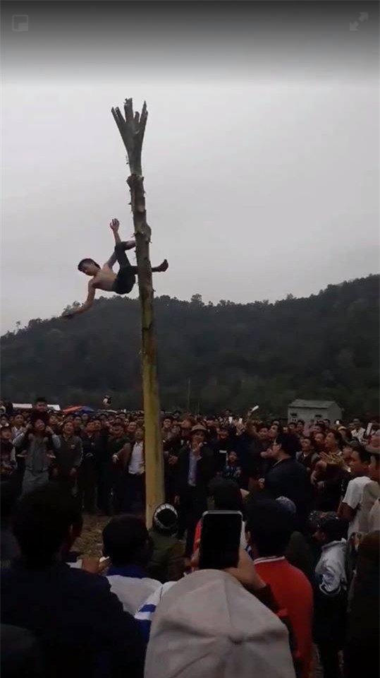 Khi gần đến ngon cây, nam thanh niên có ra tín hiệu để mọi người bên dưới tránh xa. Cuối cùng khi lên đến ngọn cây, nam thanh niên cố gắng thả hai tay để đứng thăng bằng trên ngọn cây thì bị rơi thẳng xuống đất bất tỉnh mặc dù nhiều người đã cảnh báo từ trước đó.