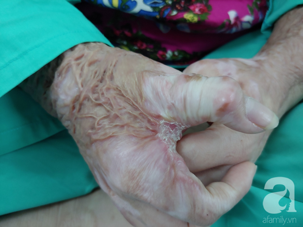 Lại gần thêm một chút, người chứng kiến đã chuẩn bị tinh thần cũng hốt hoảng. Hai tay, cổ và vùng ngực của chị Phạm Thị Ngọc Sương (24 tuổi, ngụ tỉnh Ninh Thuận) đen đúa, nhăn nheo và biến dạng như rể cây vừa bị đốt.