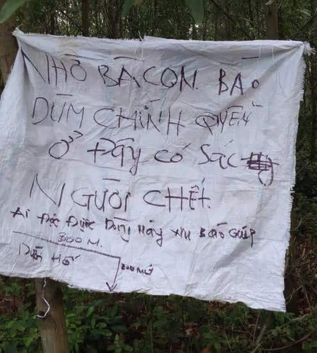 Chiếc bao gai màu trắng, ghi dòng chữ: "Nhờ bà con báo giùm chính quyền, ở đây có xác người chết. Ai đọc được dòng này xin báo giúp"