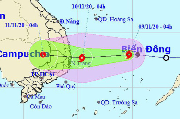 Dự báo trong 24 giờ tới, bão số 12 di chuyển theo hướng Tây, mỗi giờ đi được 15-20km và có khả năng mạnh thêm. Đến 4 giờ ngày 10-11, vị trí tâm bão ở khoảng 12,7 độ vĩ bắc; 110,4 độ kinh đông, cách bờ biển các tỉnh từ Phú Yên đến Ninh Thuận khoảng 120km về phía Đông. Sức gió mạnh nhất vùng gần tâm bão mạnh cấp 9 (75-90km/giờ), giật cấp 11.