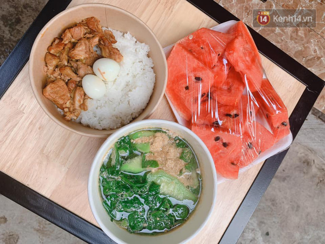 Các suất cơm gồm có rau củ quả, thịt, tôm, cơm và canh. Ngoài ra, mỗi phần đều kèm thêm nước hoa quả ép để đảm bảo đầy đủ chất dinh dưỡng.