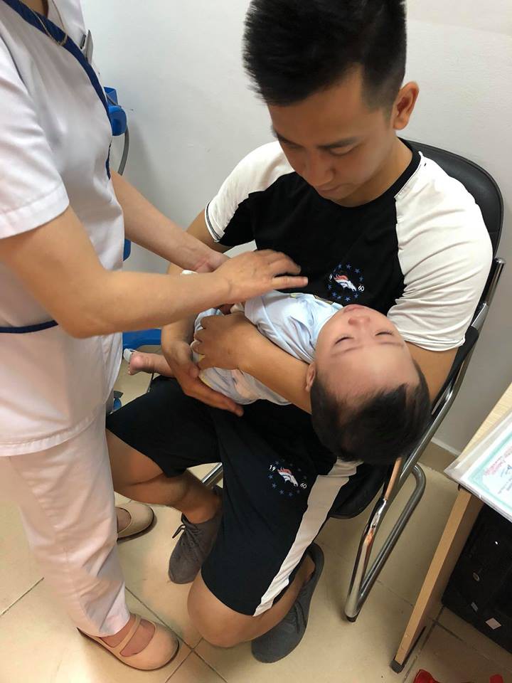 Nhân viên Y tế đang theo dõi sức khỏe bé trai