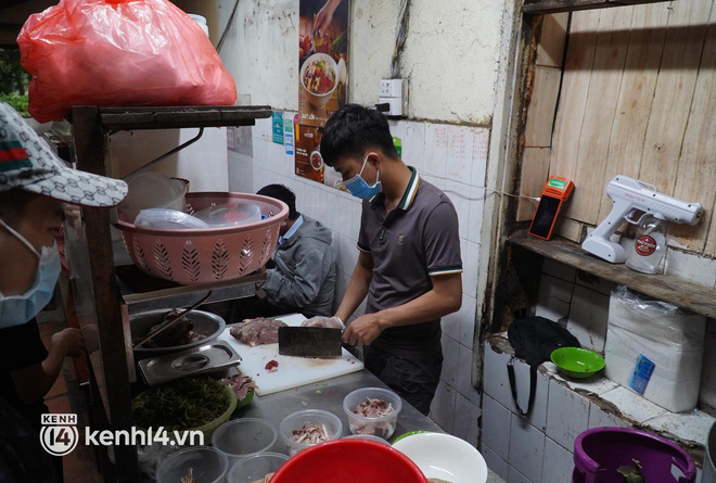 Ngoài chuẩn bị nguyên liệu, từ tối qua, anh Tuấn huy động nhân viên dọn dẹp, lau chùi bàn ghế, rửa bát đũa, sẵn sành đón khách trong sáng nay. “Chúng tôi yêu cầu khách hàng tuân thủ 5K, quét mã QR Code, giữa bàn có vách ngăn. Mỗi lần chúng tôi chỉ đón 10 khách, nếu đông quá khách đến sau phải đợi”, anh nói.