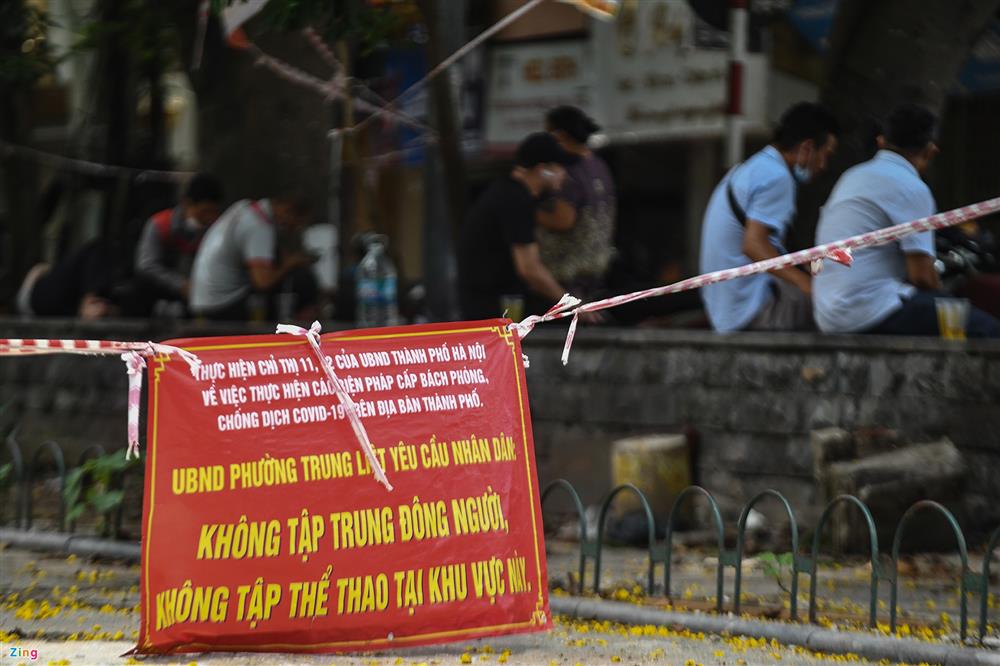 Hình ảnh tại vườn hoa phường Trung Liệt, quận Thanh Xuân (gần Ngã Tư Sở). Mặc dù đã đã có lệnh cấm tụ tập, nhiều người vẫn mua đồ ăn ở quán mang tới đây để dùng bữa, nghỉ trưa.