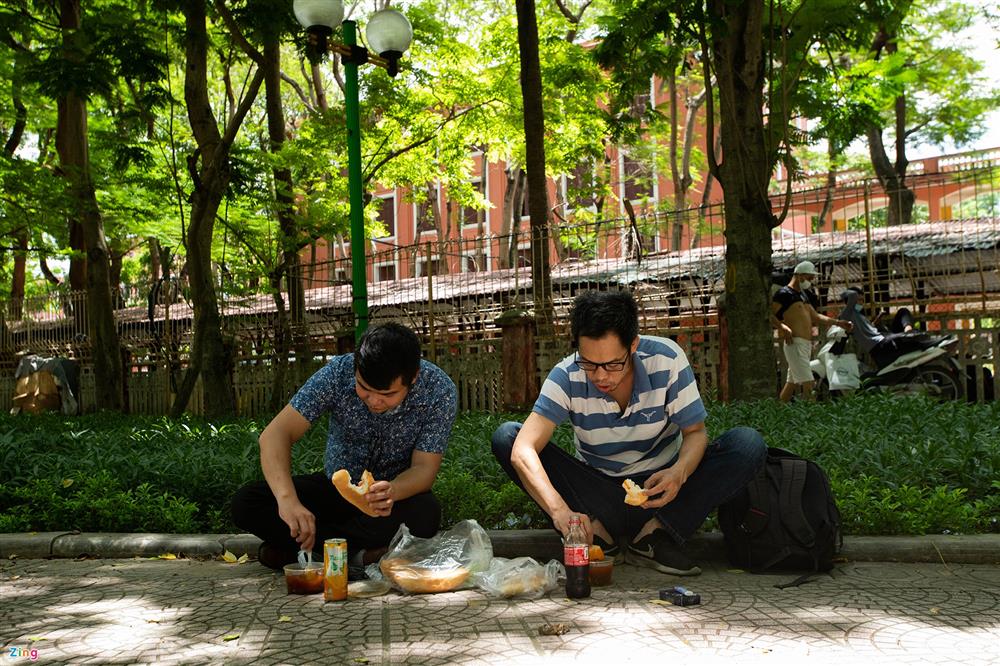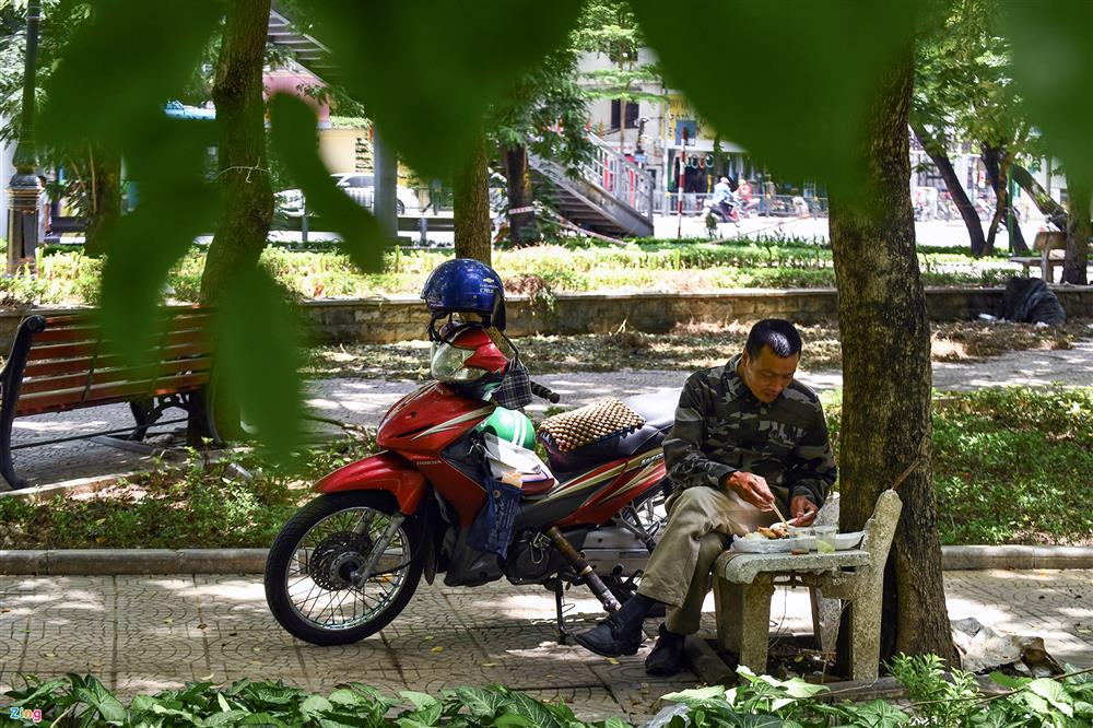Vườn hoa Đại học Thuỷ Lợi là một trong những nơi xuất hiện cảnh ăn uống dưới tán lá cây, ghế gỗ. Thời tiết tại Hà Nội đang nóng bức trở lại, vì vậy để kiếm được chỗ ngồi ăn uống nghỉ ngơi buổi trưa nhiều người phải túm tụm một chỗ, thiếu sự giãn cách trong mùa dịch.