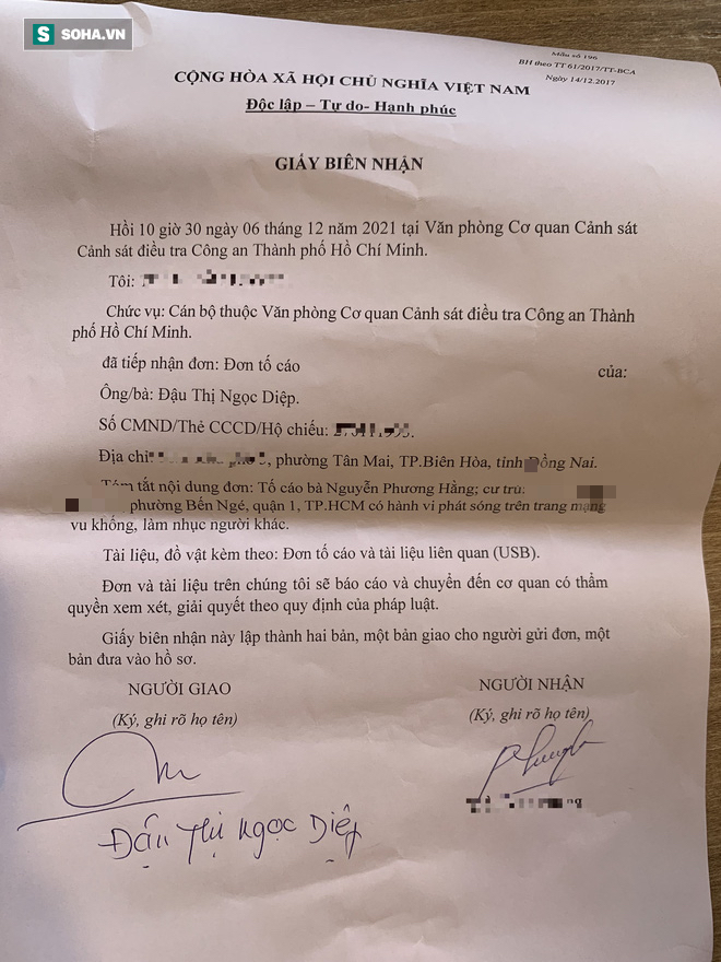 Theo ghi nhận của PV, sáng 6/12, bà Đậu Thị Ngọc Diệp (ngụ TP. Biên Hòa, tỉnh Đồng Nai) đã đến văn phòng Cơ quan Cảnh sát điều tra Công an TP.HCM để nộp đơn tố cáo bà Nguyễn Phương Hằng (CEO Công ty Cổ phần Đại Nam).