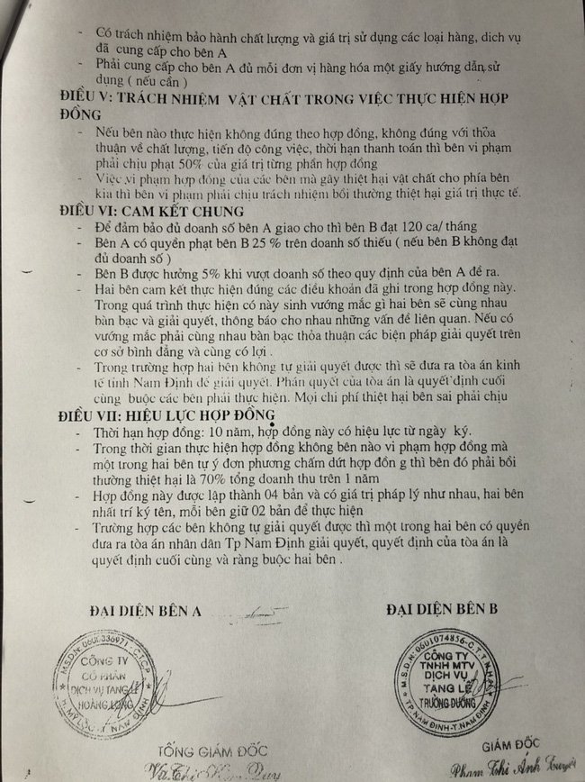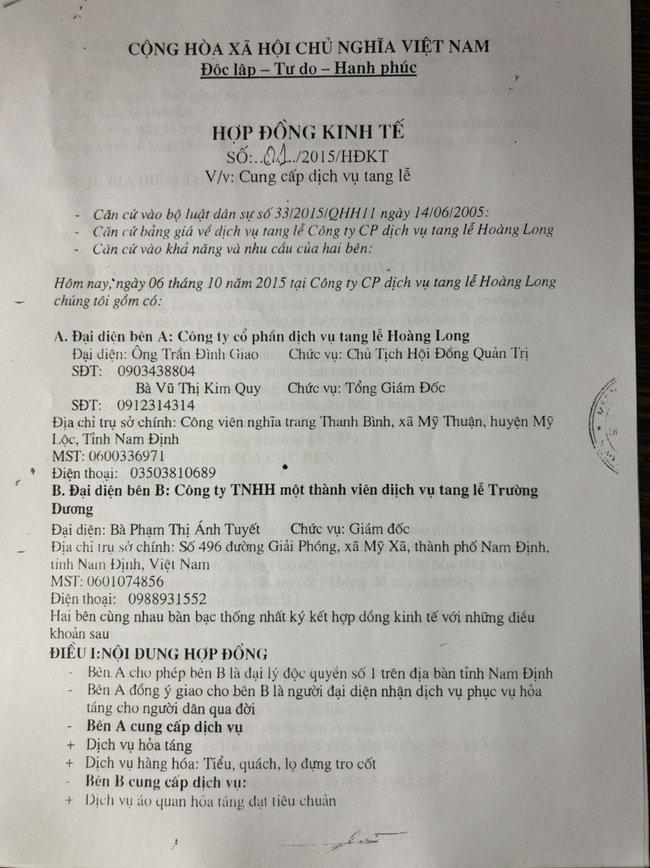 Sau khi ký hợp đồng, Công ty Trường Dương liên hệ với các cơ sở làm dịch vụ tang lễ trên địa bàn tỉnh Nam Định để thông báo và đề nghị các cơ sở khi nhận dịch vụ hỏa táng thì thông báo cho Công ty Trường Dương với thỏa thuận mỗi ca là 10.500.000 đồng, trong đó 5.500.000 đồng là tiền hỏa táng, còn lại là dịch vụ xe tang, nhang đèn.