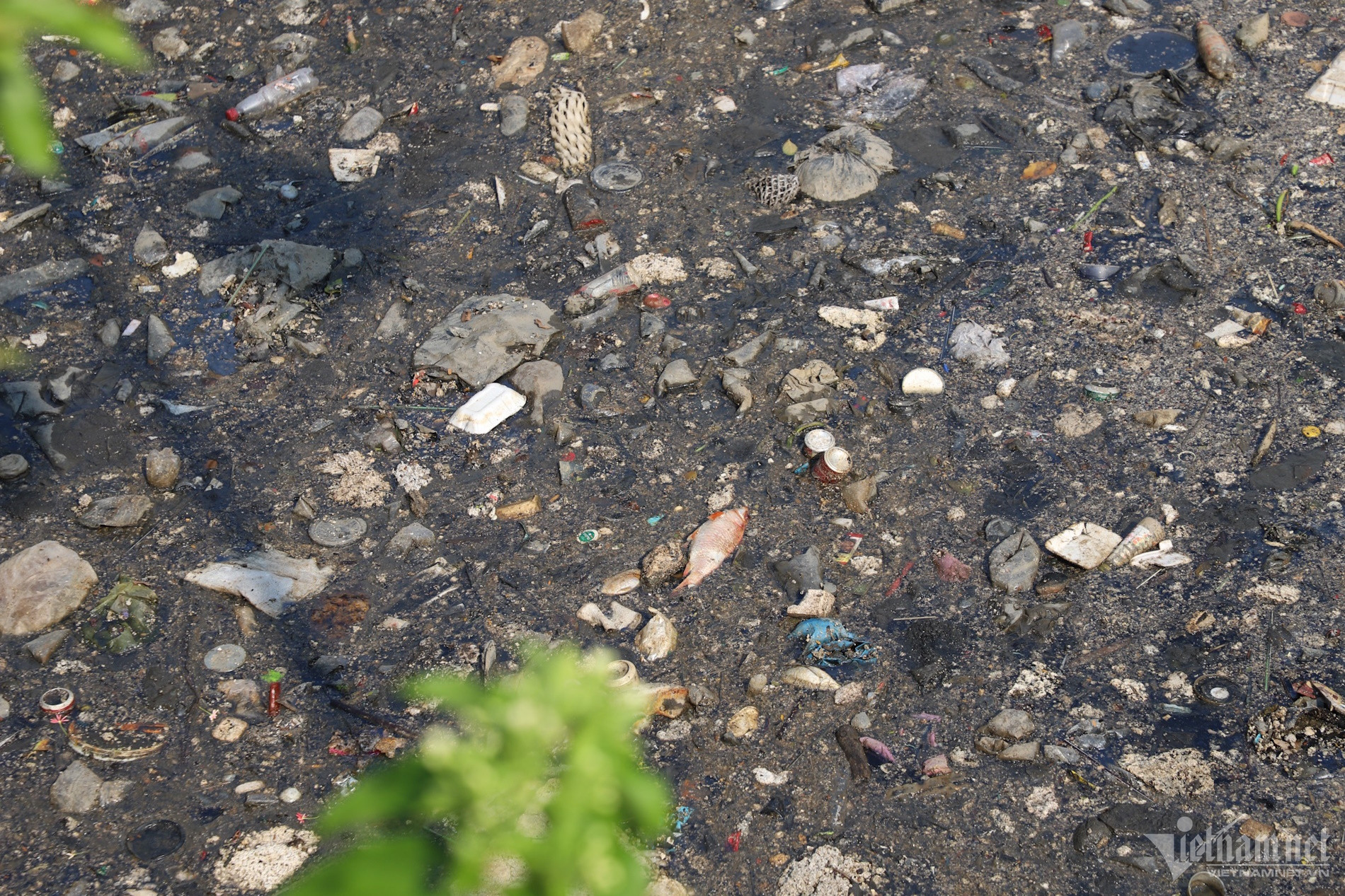 Rác thải, bùn và xác cá đọng trên kênh. Ảnh: Tuấn Kiệt