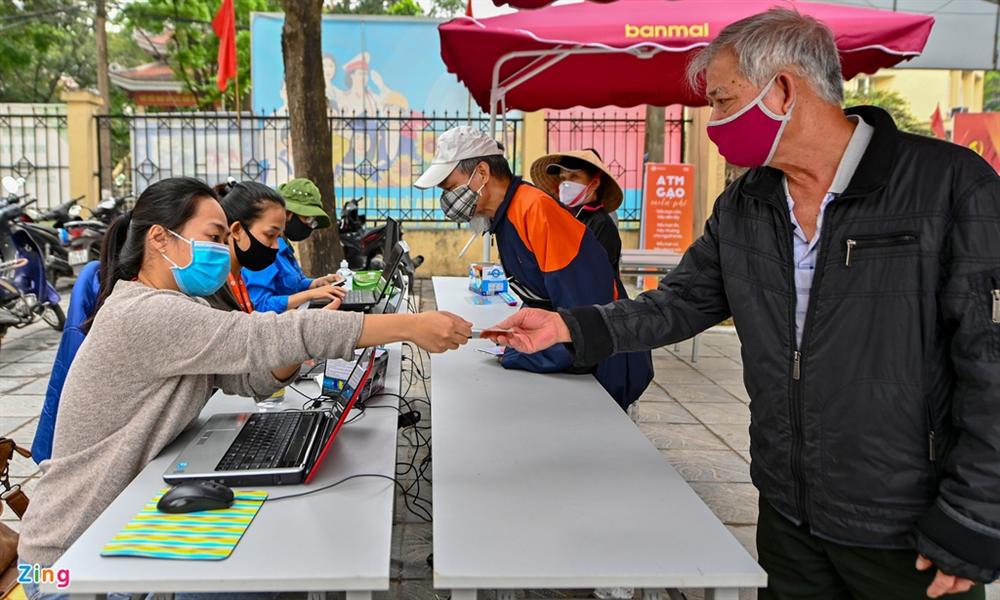 Lực lượng dân quân tự vệ đứng nhắc nhở mọi người giữ khoản cách an toàn, đồng thời ưu tiên người cao tuổi, người khuyết tật được lấy gạo trước.