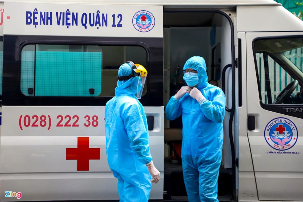 Xe cứu thương của Bệnh viện quận 12 được điều tới hiện trường để hỗ trợ một cư dân cần chạy thận tới bệnh viện.