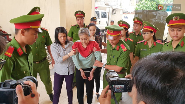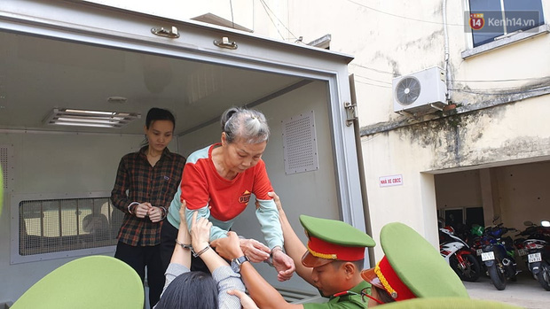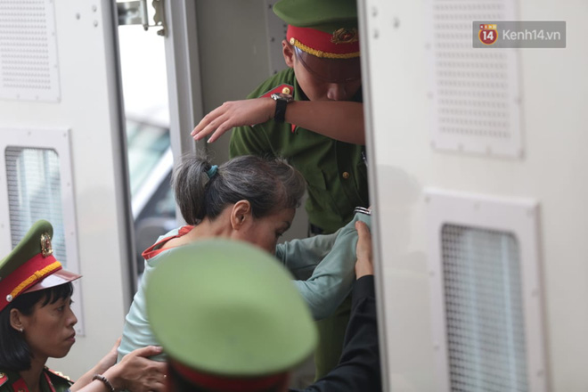 Bị cáo Trịnh Thị Hồng Hoa (mẹ của Phạm Thị Thiên Hà) chân đi không vững, được cán bộ công an dìu đến phòng xử án.