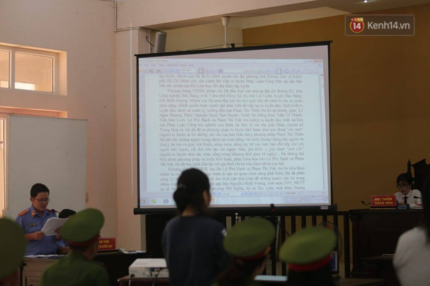 9h30, VKS đọc cáo trạng vụ án, thông tin chi tiết về hành trình gây án của chủ mưu Phạm Thị Thiên Hà cùng 3 đồng phạm. Theo điều tra, cả Hà, Thảo đều đã tốt nghiệp đại học, Hà từng đi du học nước ngoài, riêng bị cáo Huyên nguyên là thạc sĩ, giảng dạy tại một trường đại học lớn ở TP.HCM.
