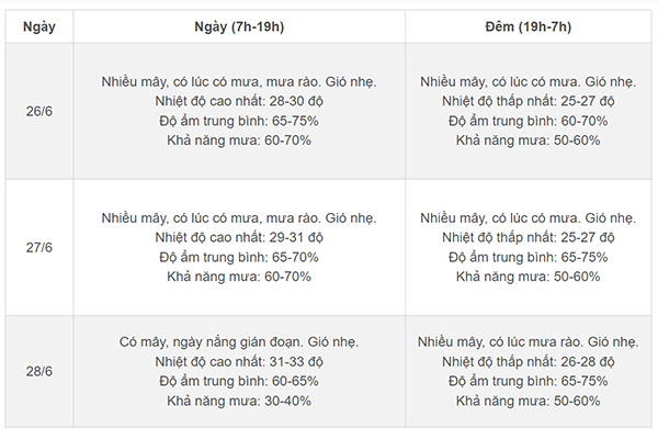 Cụ thể về thời tiết tại thủ đô Hà Nội trong 3 ngày (26-28/6):