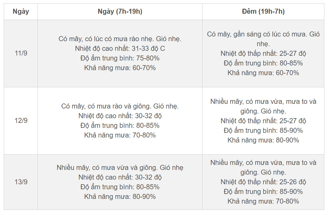 Cụ thể về thời tiết tại thủ đô Hà Nội trong 3 ngày (11-13/9):