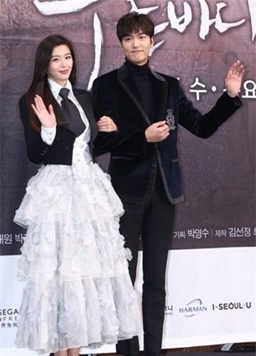 Có mặt tại buổi họp báo ra mắt bộ phim Huyền thoại biển xanh, Jung Ji Hyun rạng rỡ trong bộ trang phục mang phong cách khá lạ mắt gồm áo vest,cà vạt cùng chân váy ren xếp tầng.