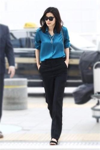 Jung Ji Hyun hút ánh nhìn khi với set đồ lịch lãm gồm quần âu và áo sơ mi lụa xanh.