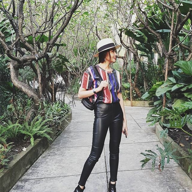 Thanh Hằng cũng chất chẳng kém gì Hà Hồ khi diện quần legging da với áo phông kẻ sắc màu.