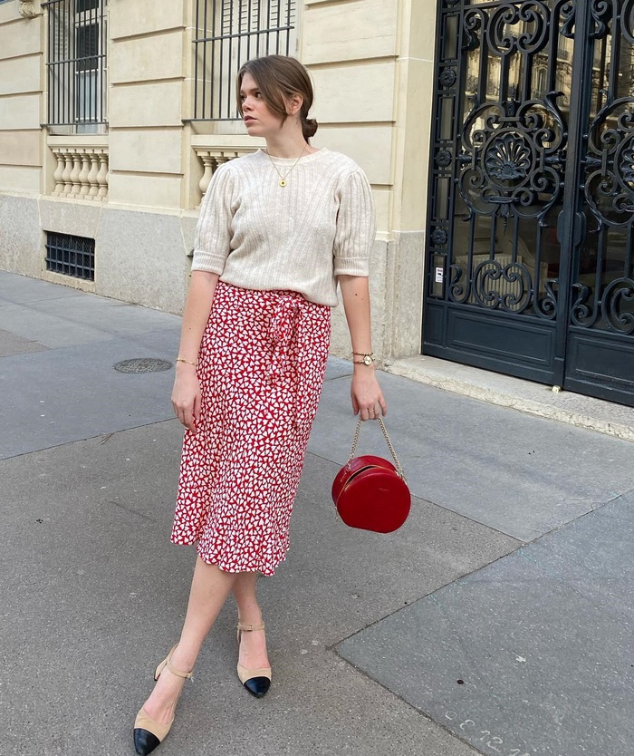 Vào những ngày mùa xuân ấm áp, các nàng có thể diện áo len cộc tay. Mẫu áo len trắng kết hợp rất ăn ý với chân váy họa tiết màu đỏ, giúp người diện có được nét trẻ trung, ngọt ngào. Để không làm giảm đi nét nữ tính của tổng thể trang phục, đôi giày cao gót hai tông màu là lựa chọn sáng suốt.