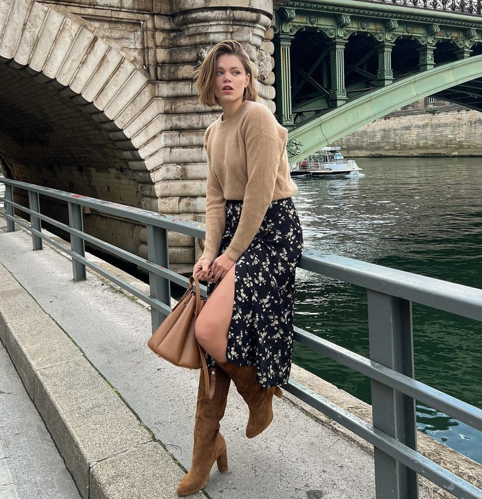 Combo áo len trắng + chân váy hoa trên đây rất nữ tính và sang trọng, đặc biệt là khi được hoàn thiện bằng đôi boots cao cổ. Chi tiết xẻ tà tạo sự thanh thoát cho đôi chân, nhờ vậy mà vóc dáng của người diện sẽ thêm cao ráo.