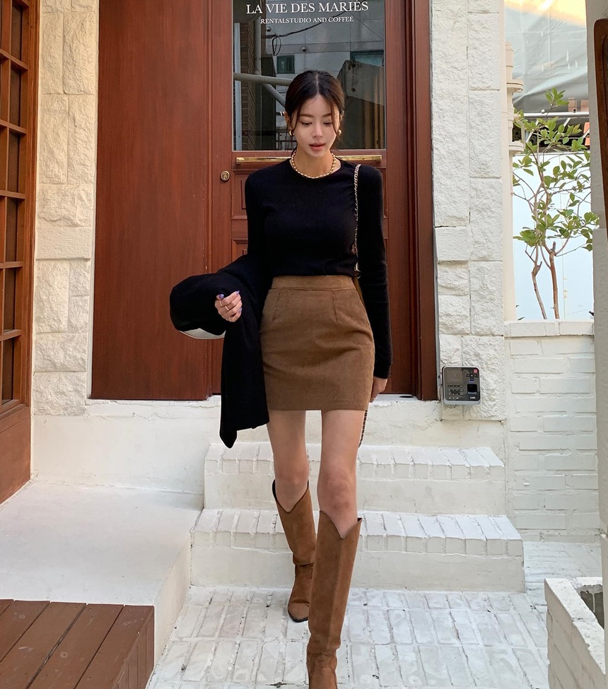 Trong những ngày thời tiết không quá lạnh, bạn có thể diện bộ trang phục gồm áo thun dài tay kết hợp với chân váy màu nâu và boots cao cổ. Bộ trang phục này có sự thời thượng và trẻ trung. Khi tô điểm vòng cổ và khuyên tai vàng, độ sang trọng của outfit sẽ lập tức tăng lên.
