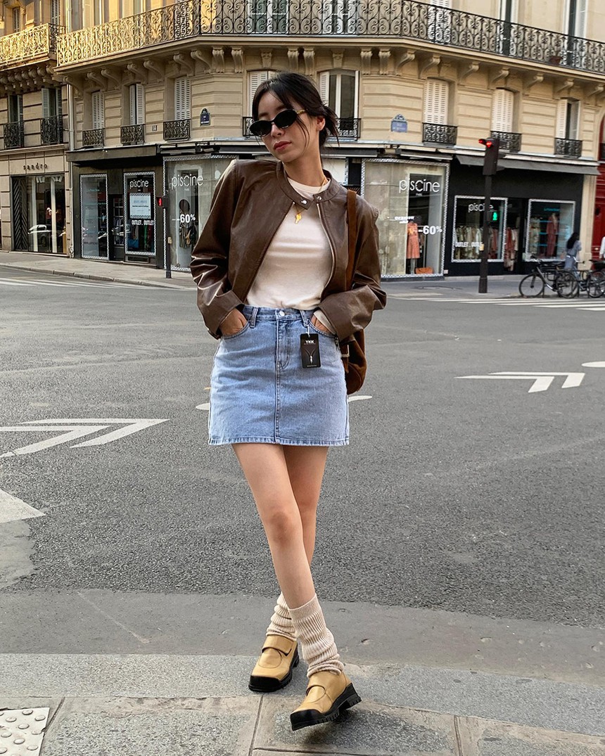 Những nàng yêu thích phong cách cá tính hãy tham khảo bộ trang phục gồm áo trắng, chân váy denim kết hợp với áo khoác da. Bộ trang phục này ghi điểm ở sự trẻ trung, năng động và rất phù hợp với không khí lễ hội. Sợi dây chuyền vàng là điểm nhấn hoàn hảo cho set đồ.