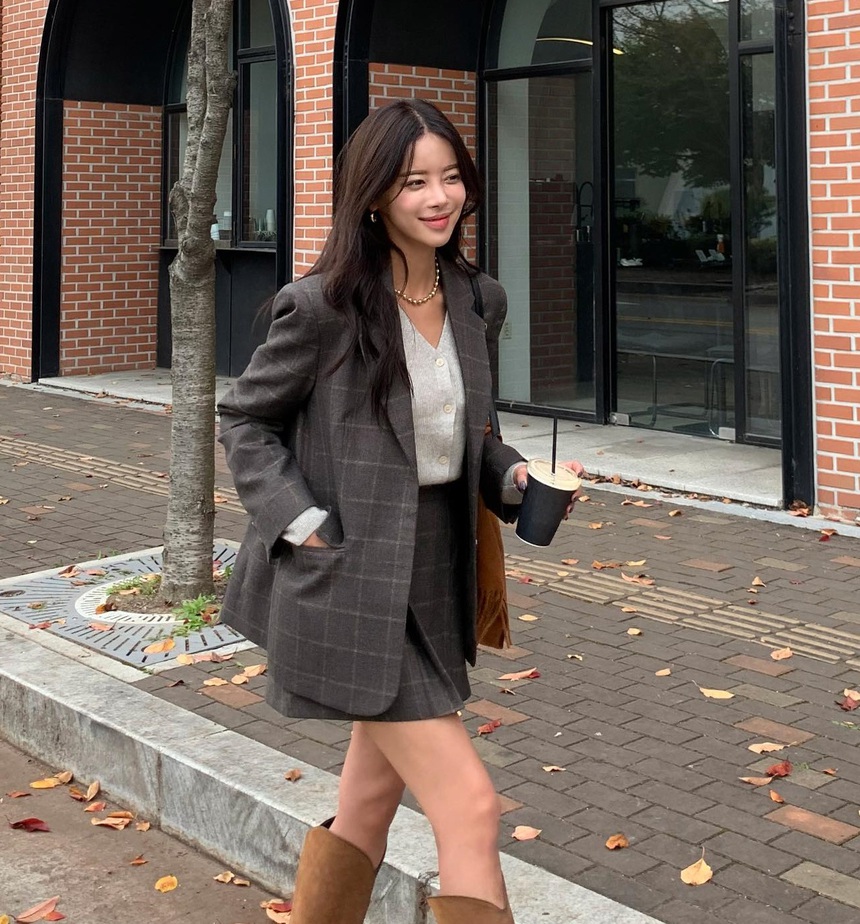 Bộ suit váy kẻ ghi điểm ở nét cổ điển và sang trọng. Khi diện bên trong bộ suit váy một chiếc áo cardigan tông màu trắng, rồi tô điểm dây chuyền, khuyên tai và một đôi boots cao cổ, tổng thể trang phục thêm nổi bật. Đây là ý tưởng diện đồ đáng tham khảo nếu bạn không thích sự cầu kỳ nhưng vẫn muốn có vẻ ngoài ấn tượng trong dịp lễ hội.