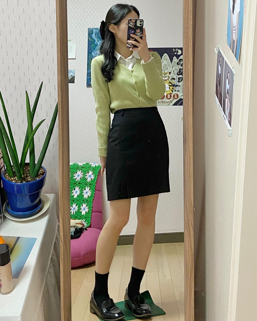 Set đồ đến công sở thường ngày với chân váy đen và sơ mi trắng sẽ trở nên thú vị hơn rất nhiều nếu bạn diện thêm 1 chiếc cardigan tông xanh pastel nhẹ nhàng. Tông màu xanh xinh tươi giúp set đồ trông ấn tượng hơn và tăng thêm nét trẻ trung, tinh nghịch cho chủ nhân.