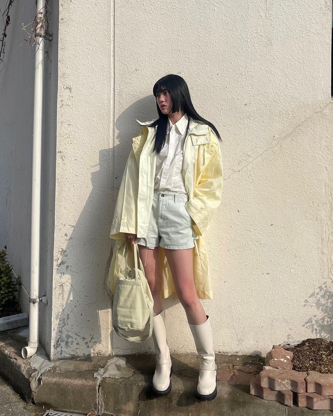 Set áo thun trắng mix cùng quần jeans vốn khá cơ bản, tuy nhiên cô nàng này lại khéo léo tạo điểm nhấn khi khoác thêm sơ mi oversized màu vàng pastel bên ngoài. Chiếc sơ mi vừa giúp che nắng lại vừa tạo vẻ năng động, phá cách cho người mặc. Với set đồ này, 1 đôi sneaker trắng sẽ là sự lựa chọn hài hòa.