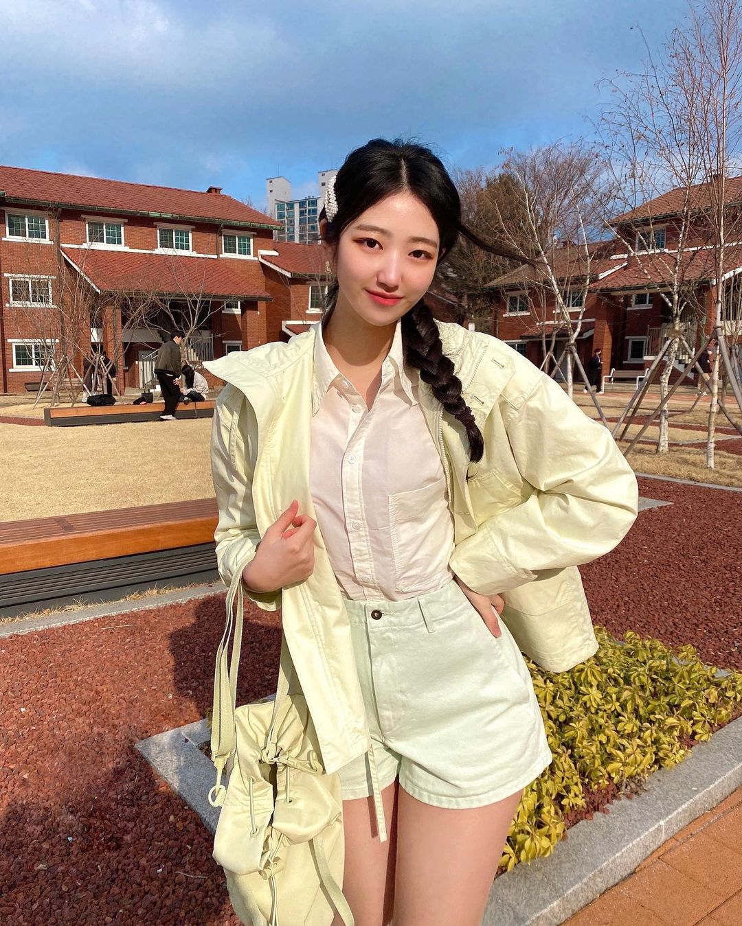 Nếu không có lợi thế đôi chân thon dài như cô nàng bên trên thì bạn có thể chọn những mẫu áo khoác dáng ngắn như cô nàng này. Nếu áo khoác dài tạo cảm giác thời thượng thì áo khoác ngắn lại tăng vẻ trẻ trung, năng động. Cô chọn kiểu tóc tết lệch, mang cặp tóc ngọc trai tạo cảm giác nữ tính, xinh xẻo.