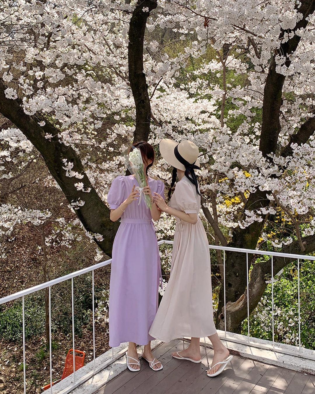 Với những địa điểm du lịch nhiều màu sắc và chi tiết thì bạn nên chọn những mẫu váy trơn màu giống như bộ đôi bạn thân này