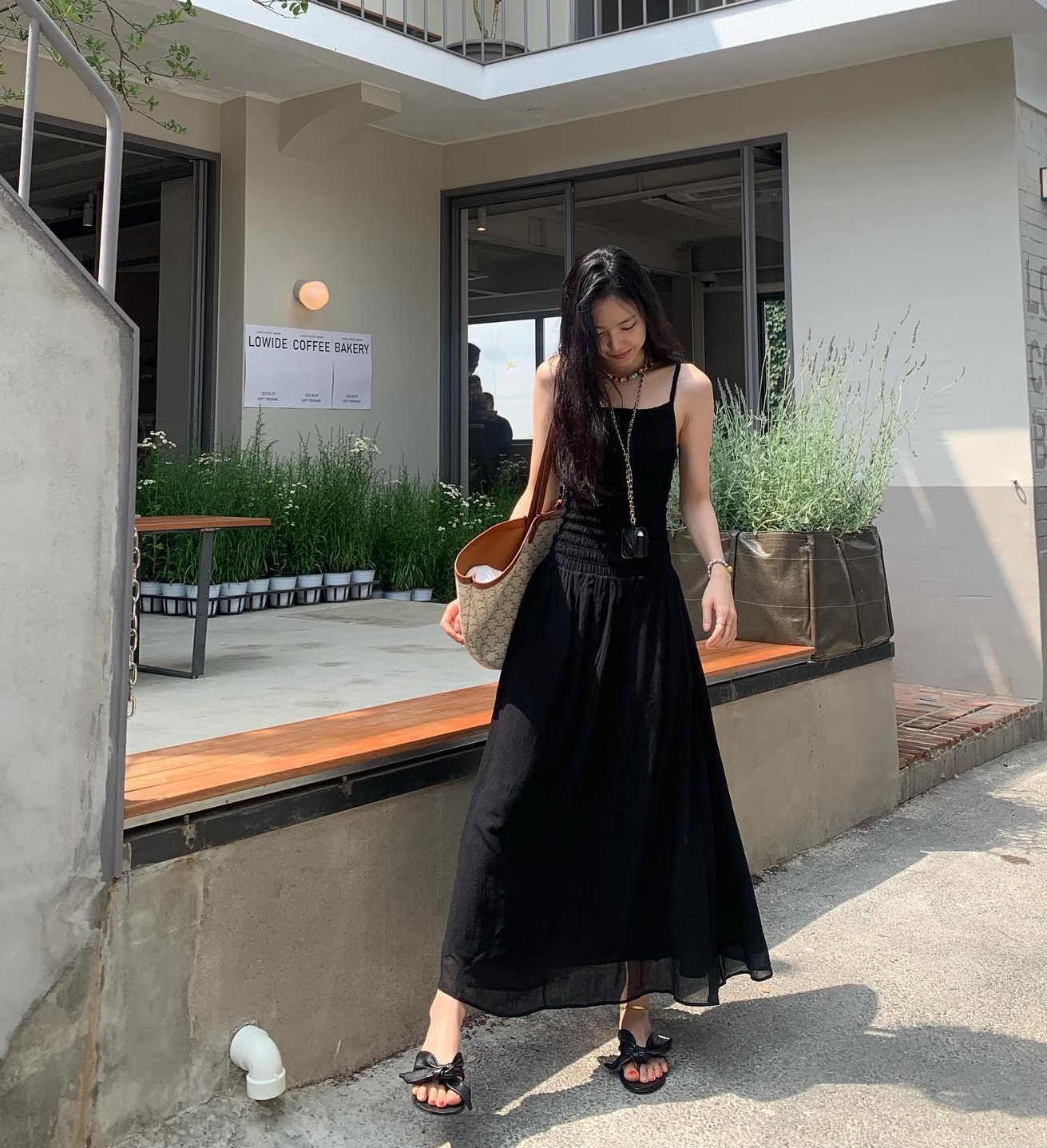Nhiều nàng thường chọn trang phục sáng màu để đi du lịch, nhưng hãy thử một ý tưởng diện đồ khác, đó là váy hai dây tông màu đen. Item này ghi điểm ở sự thời thượng, sang xịn mịn đồng thời tạo hiệu ứng dáng thon thả hơn. Váy hai dây đen không hề cộng tuổi cho người mặc. Và nhờ các món phụ kiện như vòng cổ, dép nơ, túi xách cỡ lớn, tổng thể trang phục càng thêm nổi bật, trẻ trung.