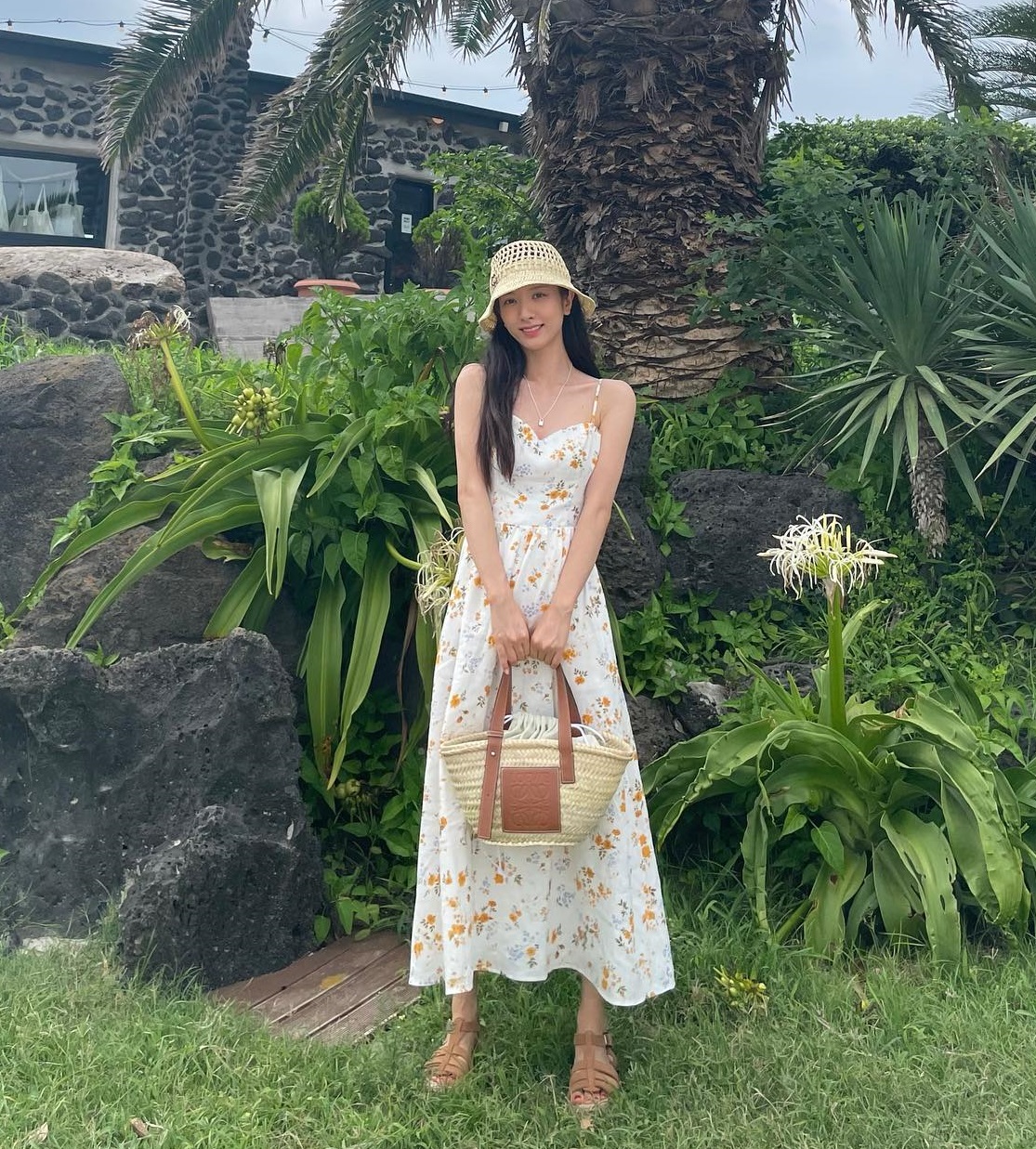 Váy hai dây họa tiết hoa là lựa chọn luôn đúng khi đi du lịch. Để có được outfit đúng chất hè, các nàng có thể tô điểm thêm mũ bucket và túi xách cói. Đôi sandal rất phù hợp với nét phóng khoáng và bay bổng của set trang phục.
