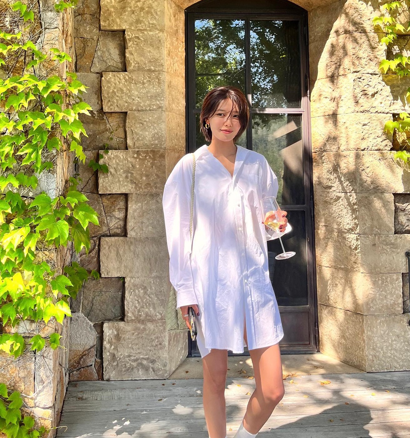 Váy sơ mi trắng dáng ngắn gây ấn tượng ở nét trẻ trung, năng động. Để tránh sự đơn điệu, chị em hãy tô điểm một đôi khuyên tai tròn. Món phụ kiện này sẽ tăng vẻ long lanh và sang xịn mịn cho tổng thể set đồ.