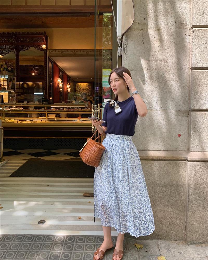 Cô nàng này lại hack tuổi trẻ trung khi diện áo thun họa tiết mix cùng chân váy xếp ly, đi giày thể thao. Set đồ này sẽ phù hợp cho những buổi dã ngoại, dạo phố.