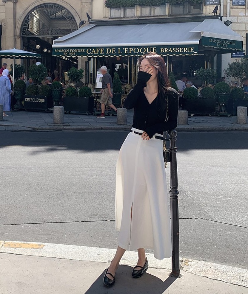 Thêm 1 công thức diện chân váy dài kinh điển, không bao giờ sợ lỗi mốt đó là combo: Chân váy dài + áo cardigan giống nàng blogger này. Cô diện set đồ xoay quanh 2 tông đen - trắng cơ bản, không quên sơ vin và dùng thêm thắt lưng để tăng hiệu quả tôn dáng.