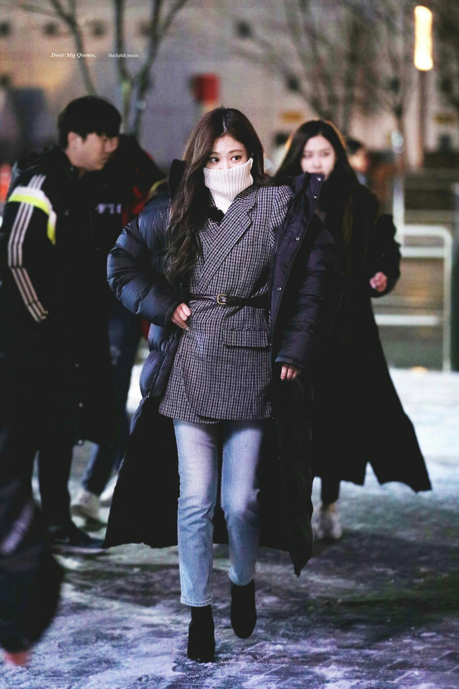 Thay vì diện áo blazer mỏng nhẹ, Jennie ưu ái blazer vải dạ ấm áp, layer bên trong áo cổ lọ. Và dù cài khuy kín mít, vóc dáng của Jennie vẫn được hack triệt để nhờ chi tiết nhấn eo, chiếc quần jeans ống đứng và đôi boots có gót.