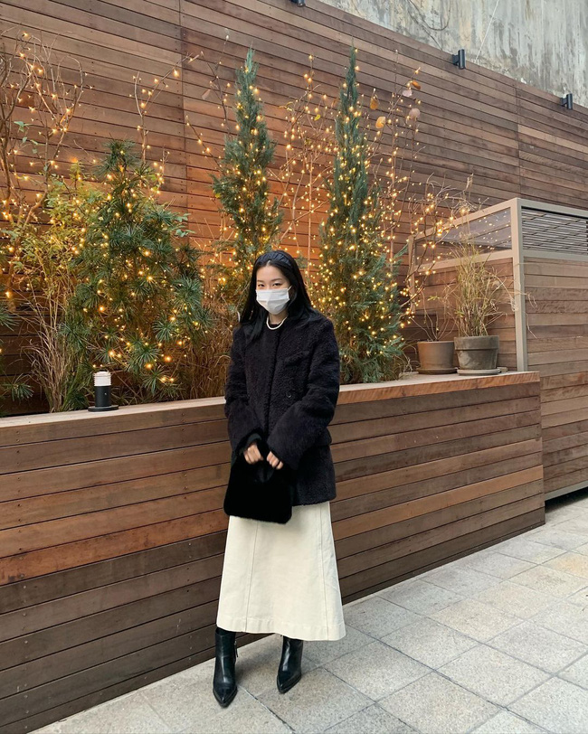 Seulgi đã gợi ý cho chị em một combo đã ấm áp còn siêu sang trong mùa Đông, đó là set đồ gồm: áo khoác lông quý phái + chân váy suông + boots thấp cổ. Gam màu be nhã nhặn của chiếc chân váy giúp đảm bảo độ hài hòa và giữ cho tổng thể trang phục không bị "dừ" đi. Set đồ này cũng không hề dìm dáng nhờ đôi boots cao gót, mũi nhọn.