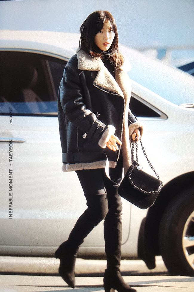 Outfit của "chị đại" Taeyeon cực chất chơi, sành điệu với sự xuất hiện của chiếc áo da cổ lông ấm áp. Tổng thể trang phục này còn giúp Taeyeon ăn gian được vài phân chiều cao, lý do là bởi cô đã khéo mix áo da dày sụ với quần skinny + boots cao cổ có gót.