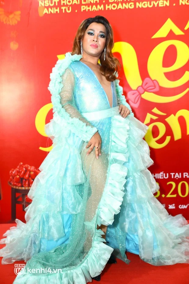 Cũng lố lăng không kém là bộ cánh xanh bạc hà mát lạnh theo hơi hướng "phòng the" của "Vedette cá viên chiên" Vũ Thu Phương. Người đẹp nên để dành nó cho một đêm diễn lô tô thay vì thảm đỏ công chiếu phim hoành tráng.