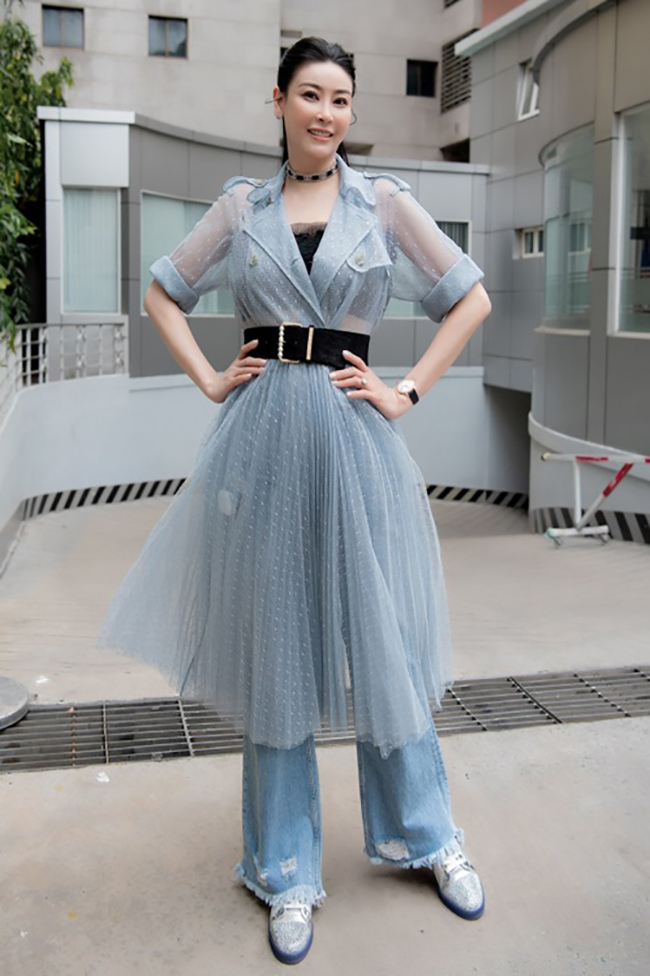 Hoa hậu Hà Kiều Anh bắt trend Gen Z khi phối váy voan với quần jeans, cộng hưởng cả lố phụ kiện rườm rà như thắt lưng hay vòng cổ.
