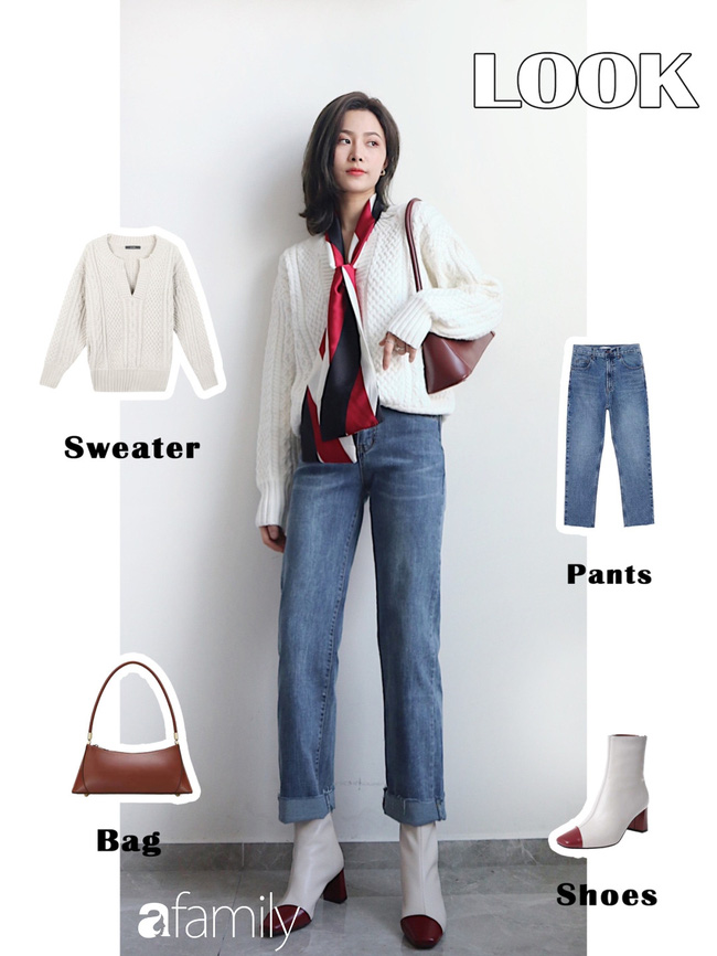 Thêm một gợi ý khác, đó chính là tạo điểm nhấn cho set đồ bằng loạt phụ kiện. Mặc dù chỉ là diện quần jeans cùng áo len trắng thôi nhưng trông cũng rất nổi bật rồi phải không nào.