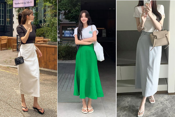Các mẫu chân váy dài như chân váy chữ A, chân váy suông, chân váy xếp ly sẽ mang đến sự sành điệu, hiện đại cho người mặc vì những phiên bản này đang là xu hướng. Khi kết hợp chân váy dài với áo thun, các quý cô trên 40 tuổi nên sơ vin gọn gàng và hoàn thiện bằng những mẫu giày như sandal cao gót quai mảnh, giày cao gót mũi nhọn để có được tổng thể trang phục chỉn chu, tôn dáng.