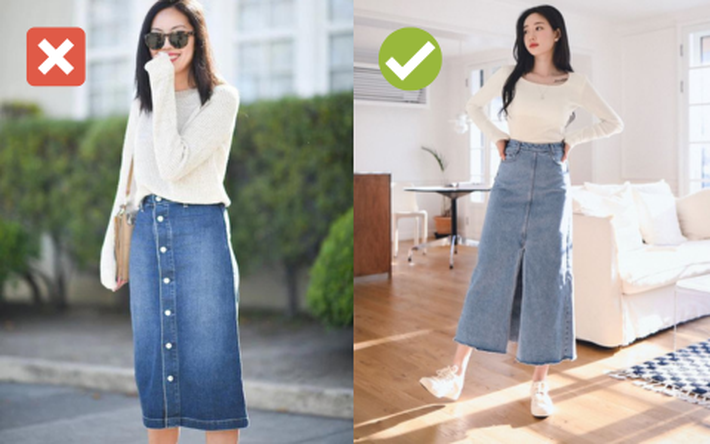 Tương tự như chân váy kéo khóa, những chiếc chân váy denim đóng cúc cũng nên được loại bỏ khỏi danh sách mua sắm của nàng. Các đường cúc chạy dọc thân váy khiến chiếc váy mất đi vẻ điệu đà và mềm mại. Ngoài ra, khi vận động mạnh hoặc ngôi xuống rất dễ khiến chủ nhân của chúng lâm vào tình cảnh đỏ mặt. Do đó, lựa chọn những mẫu chân váy denim liền, ít chi tiết là quyết định đúng đắn hơn cả.