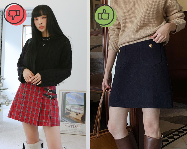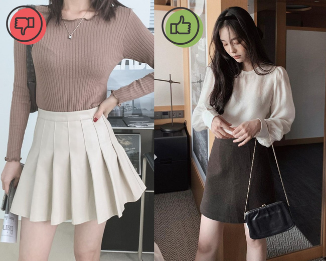 Những kiểu áo quá trẻ trung như là áo hoodie màu rạng rỡ, áo nỉ in hình "xì tin xì khói", áo len họa tiết ngộ nghĩnh, khi kết hợp với chân váy ngắn sẽ càng khiến vẻ ngoài của chị em trông lạc quẻ so với tuổi. Để diện chân váy ngắn đẹp, chị em còn phải chọn khéo kiểu áo mix cùng. Một số mẫu áo lý tưởng để kết hợp với chân váy ngắn bao gồm: áo len trơn màu trung tính, áo thun cổ lọ, áo sơ mi… Cuối cùng, bạn hoàn thiện outfit bằng một chiếc blazer, áo dạ dáng dài, trench coat hay áo khoác vải tweed là chuẩn đẹp không cần chỉnh.
