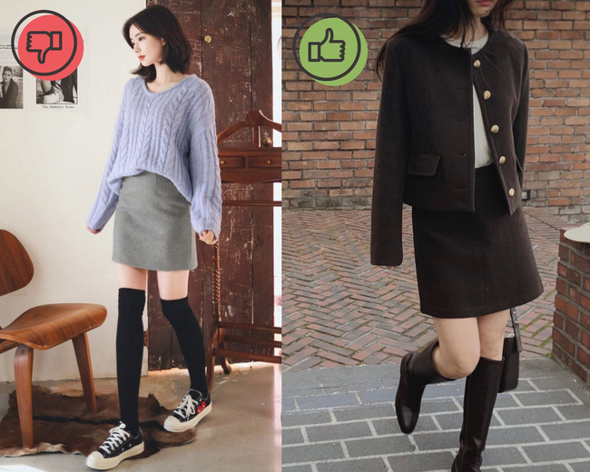 Khi diện chân váy ngắn vào những ngày lạnh, chị em có nhiều cách để giữ ấm cho cơ thể, một trong số đó là đi tất. Nếu chọn tất da chân thì sẽ rất lý tưởng, còn trong trường hợp chị em đi tất dày, cao cổ và mix cùng sneaker, vẻ ngoài sẽ lập tức trở thành "cưa sừng làm nghé". Đây là cách diện đồ chỉ hợp với những cô nàng độ tuổi 18, đôi mươi mà thôi. Lý tưởng nhất, chị em nên thay thế tất cao cổ bằng boots cao cổ. Lựa chọn này vẫn giữ ấm rất tốt cho đôi chân, lại hợp tuổi và còn tăng điểm sang chảnh cho người diện.