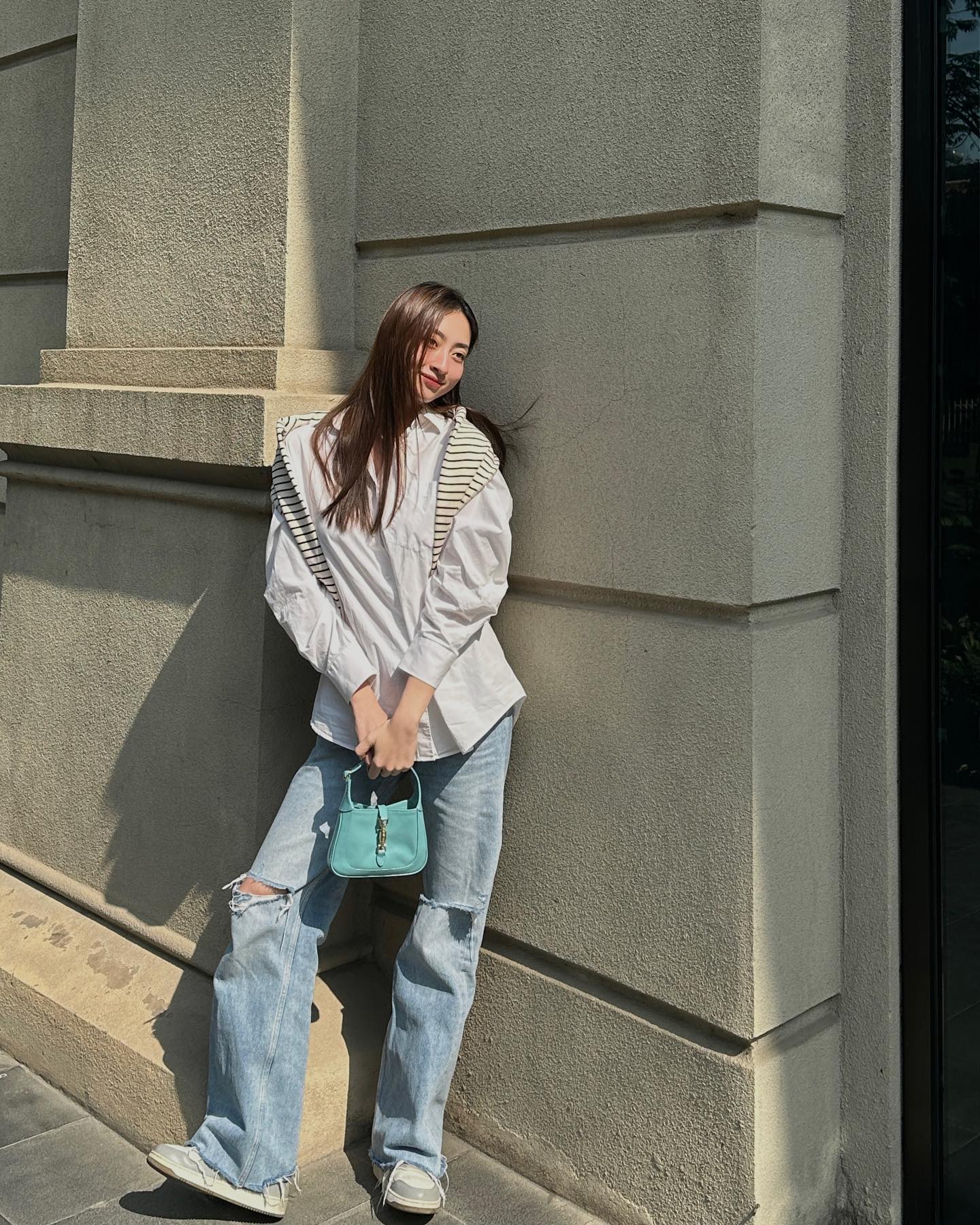 Cách diện áo sơ mi trắng rất đơn giản. Các nàng hãy kết hợp mẫu áo này cùng quần jeans xanh, quần âu đen hoặc chân váy dài để tạo nên những bộ trang phục đầy thanh lịch, tinh tế. Để tạo sự nổi bật cho set áo sơ mi trắng, các nàng hãy đeo túi xách màu pastel hoặc tô điểm áo len quàng vai.