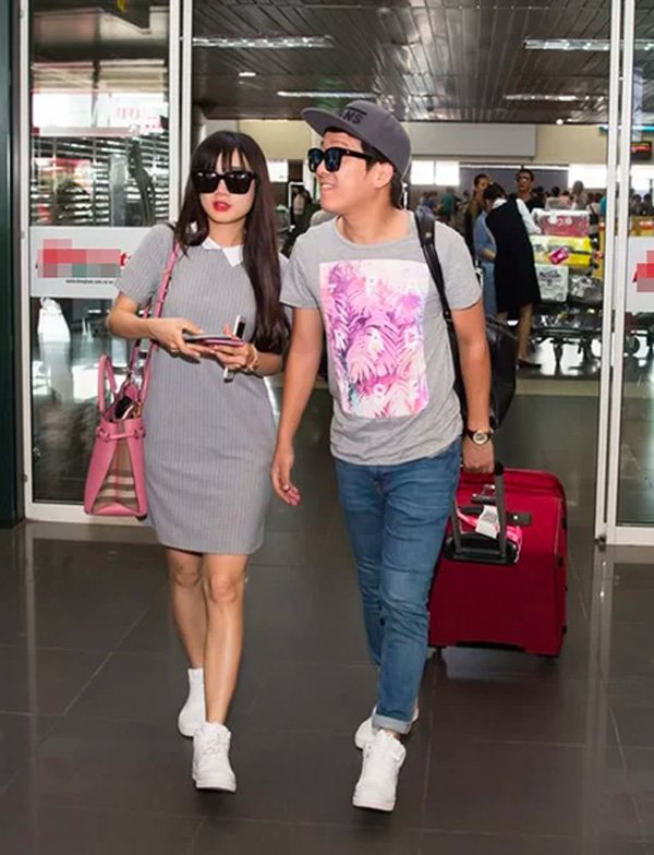 Du lịch cùng nhau, vợ chồng Trường Giang chọn kính đôi màu đen.