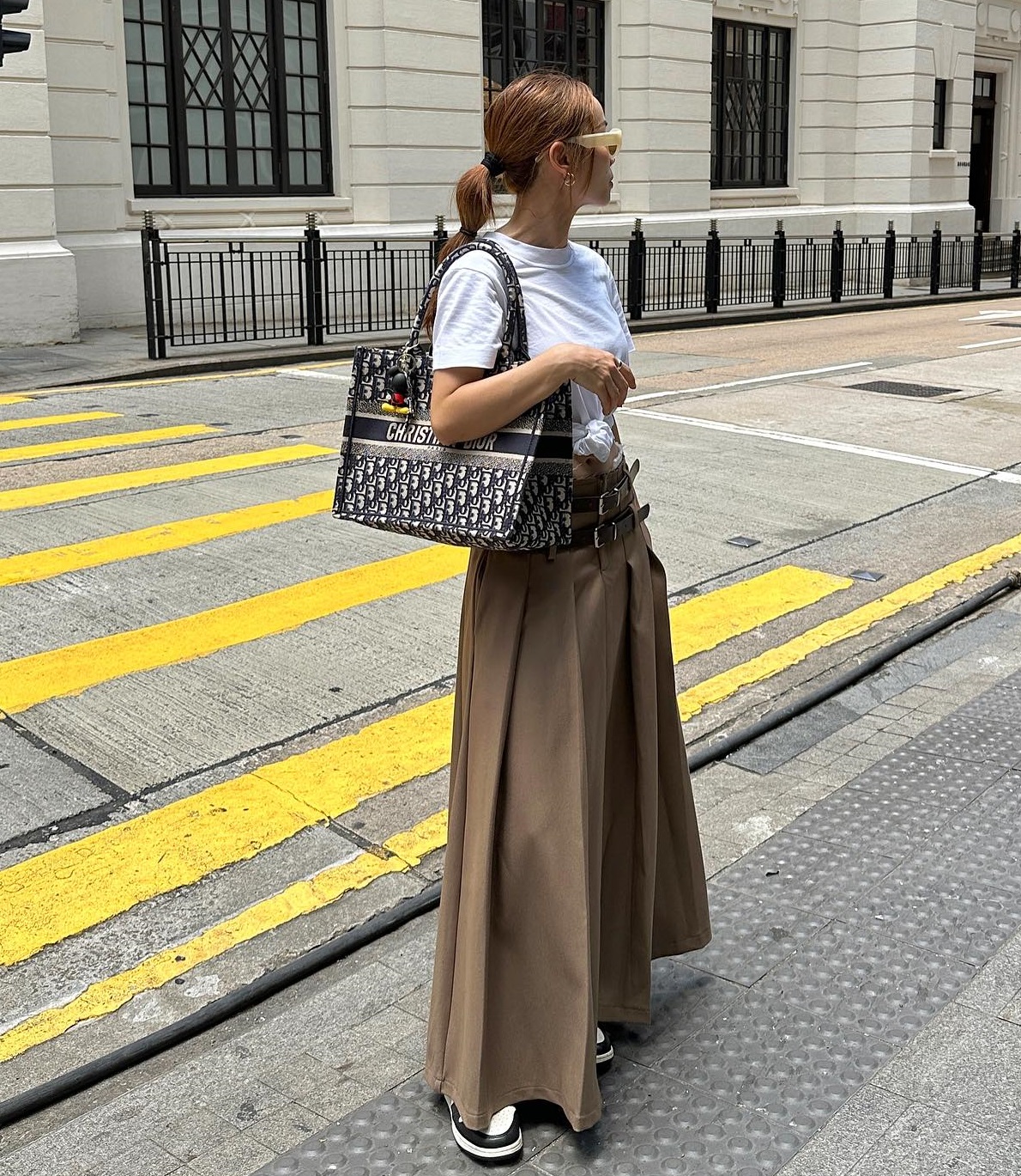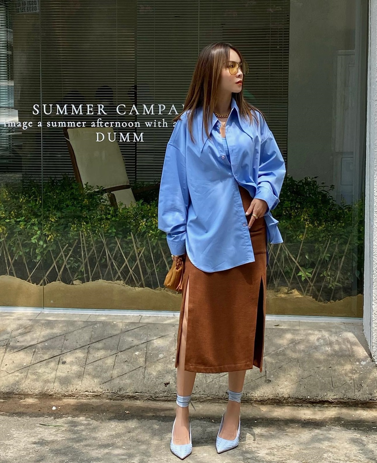 Yến Trang luôn biến hóa đa dạng khi diện chân váy dài. Cô có nhiều công thức khá bụi bặm, cá tính như chân váy kaki kết hợp với áo thun buộc eo hay chân váy xẻ tà độc đáo diện cùng sơ mi dáng rộng.